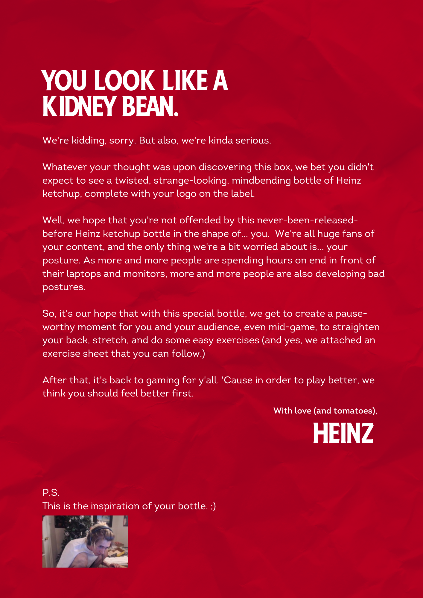 Send world-famous streamers a Heinz ketchup bottle shaped after their own bad posture. Encourage both the stars and their audience to take a pause mid-game to take better care of their health (and backs.)